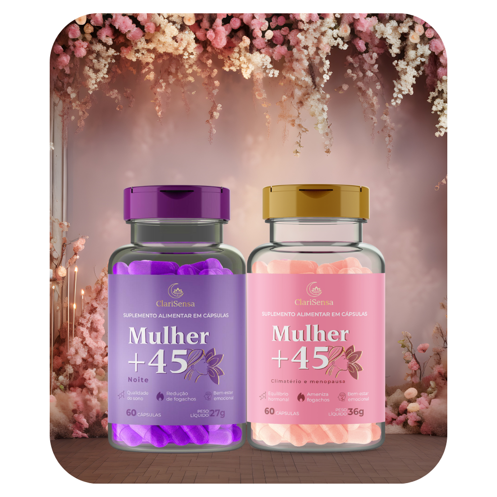 OClariSensa Mulher +45foi desenvolvido especialmente para mulheres a partir dos 45 anos, proporcionando suporte completo durante o climatério e a menopausa.Com duas fórmulas distintas, ele oferece um cuidado eficaz tanto para o dia quanto para a noite, atendendo às necessidades específicas de cada fase do seu dia.